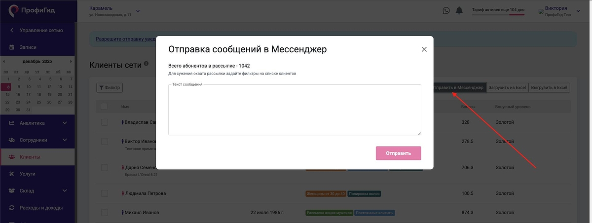 Вы можете выполнить массовую рассылку по своим клиентам из раздела Клиенты -> Отправить в Мессенджер. Для сужения охвата рассылки задайте фильтры на списке клиентов.