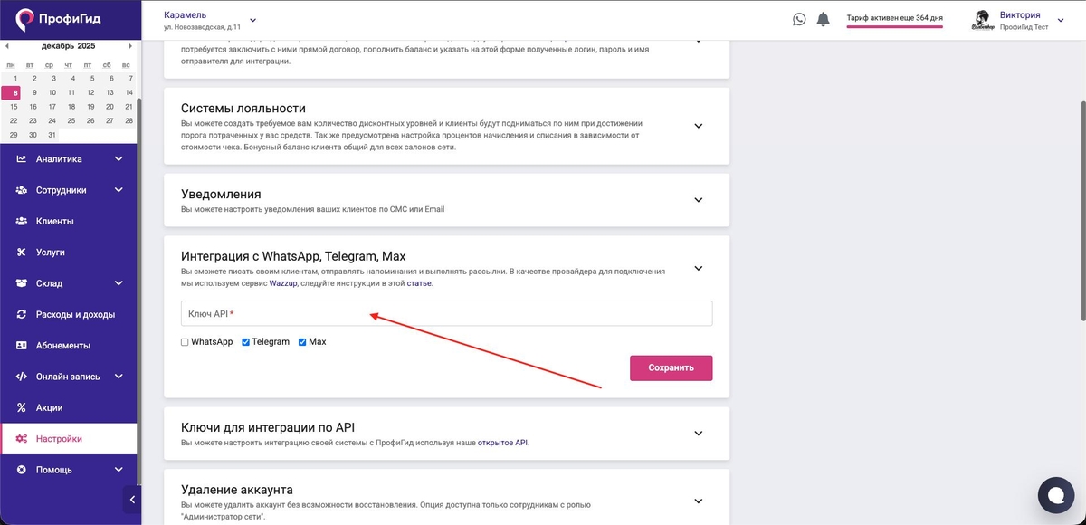 2. Перейдите в раздел Интеграции и выберите API. Скопируйте предложенный ключ и сохраните его в разделе Настройки - > Интеграция с WhatsApp системы ПрофиГид. Выберите галками мессенджеры в которые хотите отправлять сообщения, обратите внимание, что подключенный тариф Wazzup должен поддерживать этот канал связи.